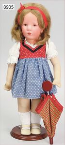 KÄTHE KRUSE Mädchen, Puppe Nr. 9, Deutsches Kind, 36 cm, Stoffkopf, Hinterkopfnaht, abgenähte Kniekehlen, schöner Orig.-Zust., Lippenbemalung wohl nachgezogen, Orig.-Kleidung, Schuhe u. Strümpfe, Orig.-Käthe Kruse Schirm