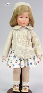 SCHILDKRÖT Typ Käthe Kruse, Tortulon, 46 cm, Kurbelkopf, blaue gemalte Augen, Perücke, bewegl. Arme u. Beine, Orig.-Kleidung u. Schuhe, unbespielt