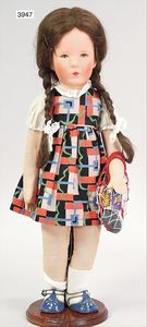 KÄTHE KRUSE Mädchen, 45 cm, Stoffkopf, Hinterkopfnaht erst unter der Perücke erkennbar, braune gemalte Augen, Trikotkörper, Orig.-Unterhemd, guter Zust.