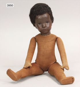 KÄTHE KRUSE Hampelchen, 3 deutlich sichtbare Hinterkopfnähte, Stoffkopf, dunkelgrün gemalte Augen, Lippenbemalung wohl 1 x erneuert, stärkere Abriebstellen sowie Lackabplatzer am Kopf, Trikotkörper, einzeln abgenähte Arme u. Beine, linkes Bein Naht erneuert u, gerissen, teilw. übernähte Finger sowie Füße, Naht Oberschenkel aufgegangen, 43 cm, mit Knopf auf Rücken, mit Käthe Kruse Kart.