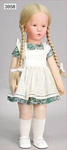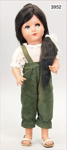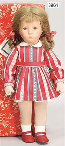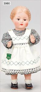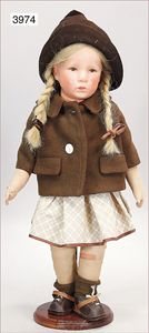 CELLBA Gretchen, 35 cm, Kurbelkopf, braune fest eingesetzte Glasaugen, fein ausmodellierte Haare, mit geflochtenem Zopf, unbespielt, mit Schild