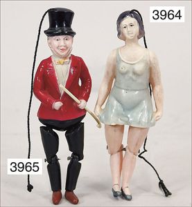 5 Teile Künstler-Biegepuppen, 50er Jahre, 12 – 16 cm, Mann, Frau, älterer Herr, 2 Kinder, Orig.-Kleidung, bespielt