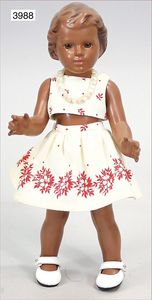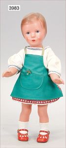 SCHILDKRÖT Karin, Tortulon, 43 cm, Kurbelkopf, dunkel ausmodellierte Haare, blaue flache Glasaugen, bewegl. Arme u. Beine, unbespielt, Orig.-Kleidung, Schuhe u. Strümpfe