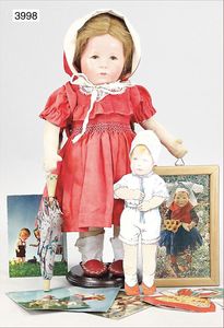 KÄTHE KRUSE Hampelchen, Stoffkopf, drei Hinterkopfnähte, braune gemalte Augen, lose angenähte Arme und Beine, 45 cm, ein wenig Krakelleebildung auf der Stirn, kl. Lackabplatzer, ein Käthe Kruse Schirm, einige Postkarten, kleine Ankleidepuppe