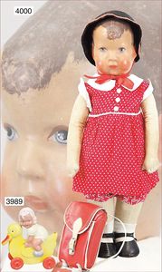 KÄTHE KRUSE Hampelchen, Glückskind, 45 cm, Stoffkopf, 3 Hinterkopfnähte, braune gemalte Augen, Trikotkörper, mit lose angenähten Armen u. Beinen, einfacher Handschnitt, Orig.-Kleidung u. Unterkleidung, Orig.-Perücke, unbespielt, selten
