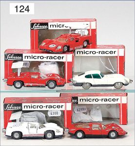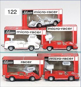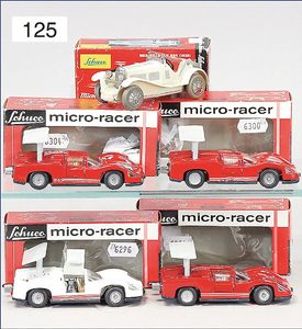 SCHUCO Konv. Micro Racer, 5 Teile, Chaperal, rot 2 x, Chaperal, weiß, Porsche Carrera 6, alles im Orig.-Kart., 1 Jaguar Kart. Falsch, neuwertig
