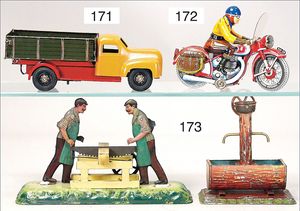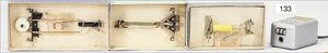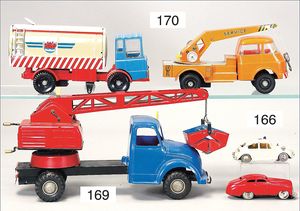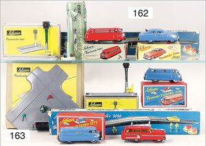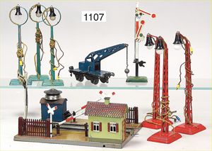 MÄRKLIN Konv., Lampen, 3 x 13447, bespielt, Lackfehler, 3 x 13452/1, bespielt, Lackfehler, 1 Flügelsignal, 1 Bahnübergang, mit Bahnwärterhäuschen, Läutewerksignal u. Schranke, Uhrwerk defekt, einige neu verlötet, 1 Kranwagen bespielt
