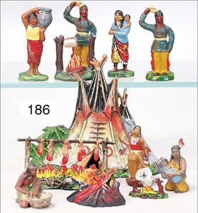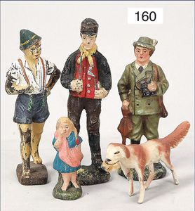 Elastolin u. Lineol, 7 Teile Eisenbahnfiguren, Verkäufer, Schaffner, 1 Bäuerin mit Kiepe, 5 cm, Zust. 2 – 3
