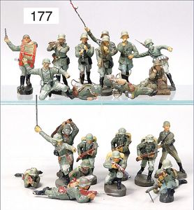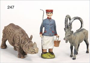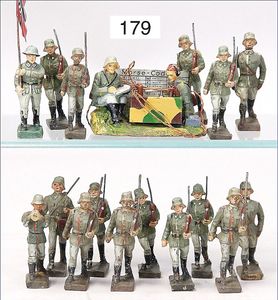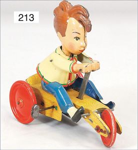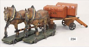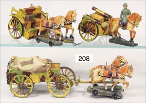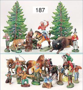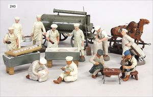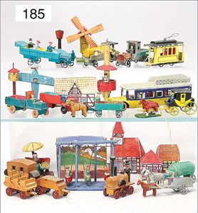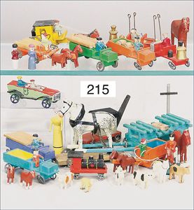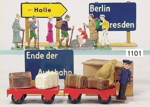 Konv. Eisenbahn-Ausschmückungsteile, Märklin, Gepäckwagen, mit Anhänger u. Figur, 3 Schilder, Blech, 6 halbplastische Zinnfiguren, 4,5 cm, 1 Kind auf Fahrrad, einige Masse-Gepäckstücke, guter Zust.