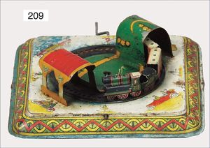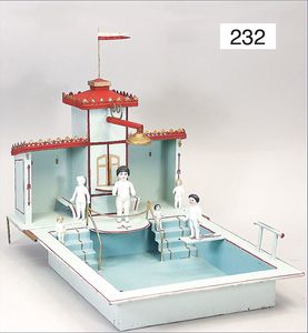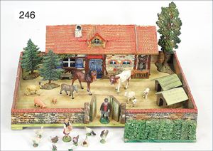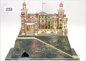 MÄRKLIN Bahnhof, mit Uhr, Grundplatte 62 x 21 cm, Höhe 34 cm, bespielt, Stuhllehnen an der Sitzreihe weggebrochen, Federwerk der Uhr intakt