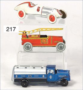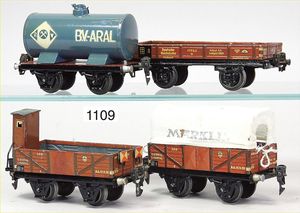 MÄRKLIN 4 Teile, Spur 0, 2-achsiger Tankwagen, Aral, Planewagen, Hochbordwagen, mit Bremserhaus, Niederbordwagen, stärker bespielt Rahmen wohl 1 x überstrichen, sonst guter Zust.