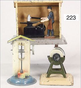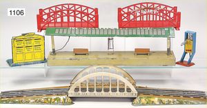 Fundkiste, Kibri, Bahnsteigüberdachung, mit Bänken u. Flügelsignal, 2 Teile Bogenbrücke, rot, 1 x bespielt, gut, 1 x 1 Seite angerostet, 1 Bogenbrücke mit Auf- u. Abfahrrampe, elektr. Ausführung, Spur 0, bespielt, Lackfehler, 1 Fahrkartenautomat, Bing, Lackfehler, 1 Richtungsanzeiger, Bing, guter Zust.