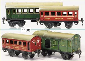 MÄRKLIN Spur 0, Mitropa-Speisewagen, rot, 2-achsig, 1 Tür fehlt, Mitropa-Schlafwagen, rot, 2-achsig, 1 Gepäckwagen 1728, mit Schlusslicht, 1 x 4-achsiger Personenwagen 1751,