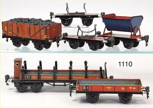 MÄRKLIN Spur 0, 5 Teile Güterwagen, 1852, 4-achsiger Rungenwagen, mit Bremserhaus, 1771, Hochbordwagen, 2-achsig, mit Kohleeinsatz, Kipplore, 1772, Niederbordwagen, 2 Teile Holzwagen ohne Holz, leicht bespielt, gut