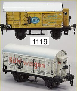 MÄRKLIN Spur 0, Konv. 2 Teile, 1793, Kühlwagen, mit Bremserhaus, 2-achsig, 18,5 cm, guter Zust., 1792, Kühlwagen Jamaica (Bananenwagen), 2-achsig, 18,5 cm, mit Bremserhaus, bespielt, Lackfehler