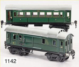 MÄRKLIN Spur 0, 2 Teile, 1751, 4-achsiger Personenwagen, 2. Klasse grün, 1754, Gepäckwagen, 4-achsig, 24 cm, beide guter bis sehr guter Zust., mit nur geringen Spielspuren, beide im Orig.-Kart