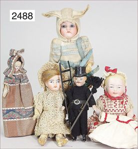 Konv. Stubenpuppen, Baby, Ganzbiskuit, 12 cm, Biskuit-Brustblattkopf-Puppe, blaue fest eingesetzte Glasaugen, geschl. Mund, Masse-Stehkörper, mit Hasenkostüm, 17 cm, kl. Schornsteinfeger, Ganzbiskuit, mit anmodelliertem Hut u. Schnurrbart, 10 cm, kl. Groednertal Puppe, kl. Biskuit-Porzellankopf-Puppe, Frankreich