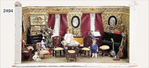 1-tlg. kl. Puppenstube, Musikzimmer, um 1900, 60 cm breit, möbliert, 2 Puppenstubenpuppen, reichh. Zubehör