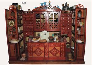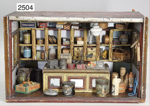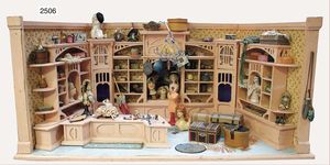 Modeladen, 1,17 m breit, 55,5 cm hoch, 54 cm tief, reichh. teils hochwertiges Zubehör, Halbpuppen, Schachteln, Dosen, Stoffteile, mit Theke, Bemalung etwas später, sehr dekorativ