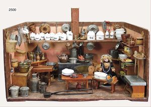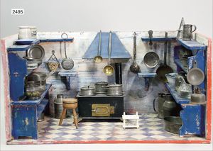 Küche mit kl. Rauchfang, 78 cm breit, 41 cm hoch, 47 cm tief, 2 Eckschränke, Regale, Weißblechteile, Porzellangefäße, Kupferformen, mit frühem Herd, kl. Biskuitporzellankopf-Puppe