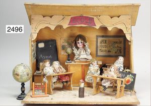 Puppenstubenschule, Frankreich, Automat, 39 cm breit, 30 cm hoch, Lehrerin mit Pult, Musikspielwerk mit Bewegung, Puppe dreht den Kopf u. hebt die Arme, 5 Puppenstubenpuppen, Schüler, Zubehör, Orig.-Holzkiste zum Aufklappen