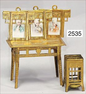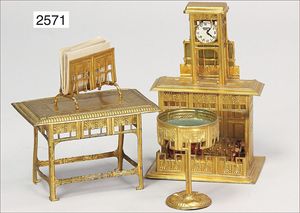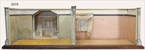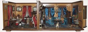 2-tlg. herrschaftl. Puppenstube, mit seitl. Erker, 97 cm breit, 38 cm hoch, die Breite gerechnet ohne Erker, Durchgangstür vertäfelt, Boden mit Intarsien-Einlegearbeit, hochwertig möbliert, reichh. Zubehör, Messing/Blech vergoldet, Leuchter, Schirmständer, einige Zinnteile, mit Puppenstubenpuppen