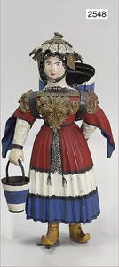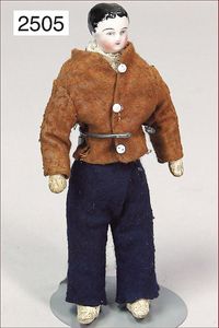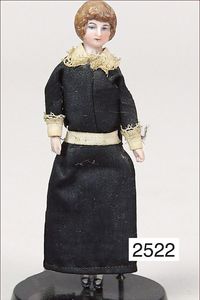 Puppenstubenpuppe, Hausmädchen, Biskuitporzellan-Brustblattkopf, ausmodellierte braune Hochsteckfrisur, blaue gemalte Augen, Biskuit-Unterarme u. –Beine, ausmodellierte Schuhe u. Strümpfe, Stoffkörper, alte Kleidung, 13 cm