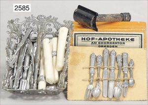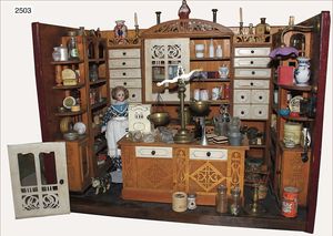 OTTO MAIER RAVENSBURG Kaufladen, eingerichtet als Apotheke, 69 cm breit, 56 cm hoch, Schubladen, seitl. Regale, Schiebetüren mittig, Orig.-Theke, reichh. Zubehör, dekorativ