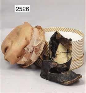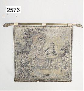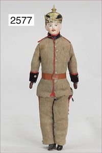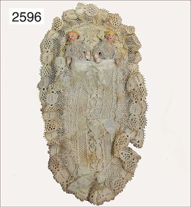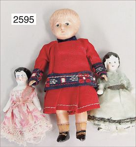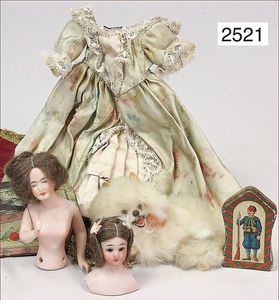Konv. Ausschmückungsteile für Stube, 1 Halbpuppe, Porzellan, mit bewegl. Armen, Kopf leicht geneigt, 1 Echtfell-Hund, liegend, Spitz, Länge 7 cm, 1 Brustblattkopf-Puppe, Brutblatt geklebt, gr. Ecke der linken Schulter fehlt, 1 altes Kleid für Puppe ca. 15 cm, 1 Teppich für herrschaft. Puppenstube
