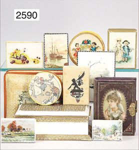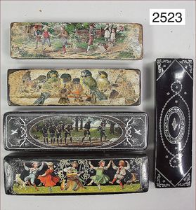 Konv. Holzboxen für Schreibmaterial, 5 Stück, mit untersch. Motiven, eine gefüllt mit Schreibmaterial, Länge 12 cm