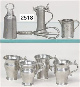 Konv. Ausschmückungsteile für frühe Küche, 4 Silberkrüge, dazu 1 Messbecher Aufschrift „1 Liter“, gemarkt W.G., 1 Milchkanne, Höhe der Becher 3,5 cm, Durchm. 3 cm
