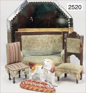 Ausschmückungsteile für Puppenstube, 1 x kl. Porzellan-Hund, 8 cm, dazu Sitzgruppe, Holz, mit Samtbezug, 2 untersch. Stühle, 1 Couch, 12 cm lang, rosa Spiegel, Durchm. 16 cm, 8-eckig