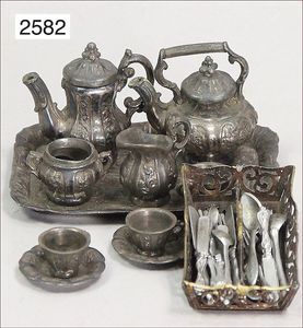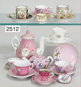 Konv. Puppenservice, zartrosa, 3 Kaffeetassen, 2 x gleiches Motiv, 4 Untertassen, 1 Kaffeekanne, 1 Teekanne, dazu mehrere untersch. Teller, farbl. dazu passend, u.a. Limoges france elite, schönes Konv., in schöner Papiermaché-Truhe