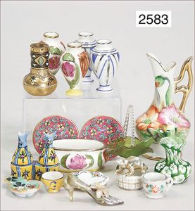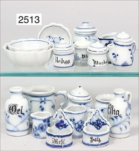 Konv. Puppenstubenporzellan, blau/weiß, Essig- u. Ölkrüge, 3 untersch. Schüsseln, Fässer, Muskat, u. mehr, Porzellandosen, salz- u. Mehlmetze
