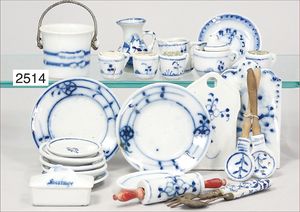 Konv. Puppenstubenporzellan, blau/weiß, 4 Kaffeetassen, Teller, tiefe Teller, 2 untersch. Schneidebrettchen, Heringsdose, Eimer, dazu 1 x Gabel u. Löffel, mit blau/weißem Porzellan, Nudelholz, Porzellan, sehr schönes Konv.