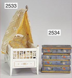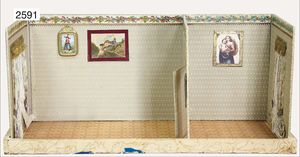 gr. Puppenhaus, ca. 97 cm hoch, 98 cm breit (ohne den kl. Balkon gerechnet), außen Tapete stärker verschlissen, innen sehr schöne Orig.-Tapete an Wand u. Boden, Orig.-Vorhänge, möbliert, mit Zubehör, einige Teile zusätzlich zum restaurieren, um 1900