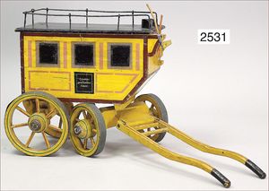 Kutsche mit Rentier, Blech u. Bastteile, 10 cm, 2 Ganzbiskuit-Puppen