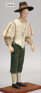 BIEDERMEIER Puppe, Mann, glasierter Brustblattkopf, fein ausmodellierte Haare, gemalte Augen, Lederkörper, 17 cm