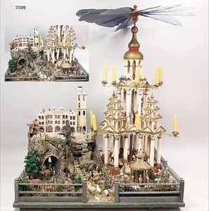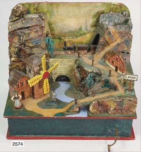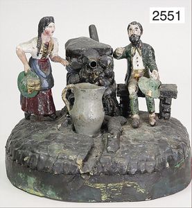 SCHILKRÖT in Raute, Einbindekopf, mit Musikdruckspielwerk, 2 Kinder, mit Bewegung der Arme, untersch. Gesichtszüge, Mädchen u. Junge, 2 Glocken fehlen, sonst sehr guter Zust., 27 cm lang, 13 cm tief, 20 cm hoch, selten, schöner Orig.-Zust.