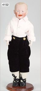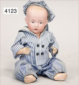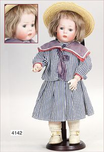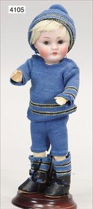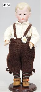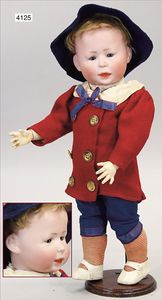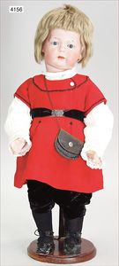 KÄTHE KRUSE Junge, Puppe Nr. 1X, 35 cm, Kunststoffkopf, Trikotkörper, blaue gemalte Augen, Orig.-Perücke, sehr guter Zust., Orig.-Kleidung, Orig.-Kart., leichte Abriebstelle durch Lagerung auf der Nasenspitze, sonst nahezu unbespielt