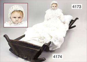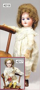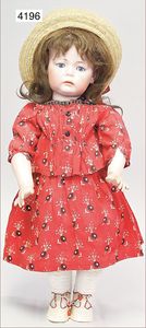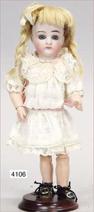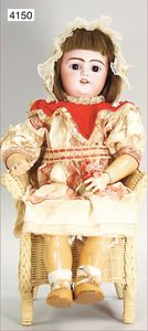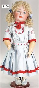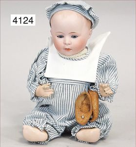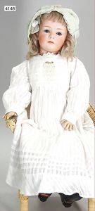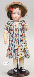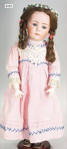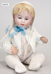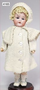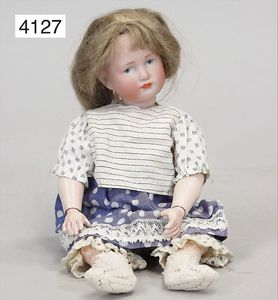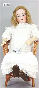 SCHÖNAU & HOFFMEISTER 4000 4/0, 32 cm, Kurbelkopf, blaue fest eingesetzte Glasaugen, off. Mund, oben Zähne, Gliederkörper, bespielt, Arme übermalt, Perücke neuer