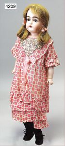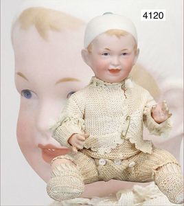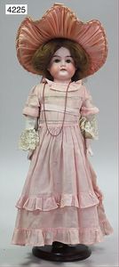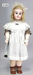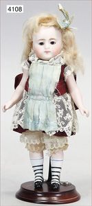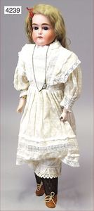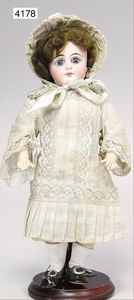 BAEHR & PRÖSCHILD 297, Biskuitporzellan-Kindergesichtpuppe, Dep, Kurbelkopf, braune Schlafaugen, off. Mund, oben Zähne, Kinngrübchen, franz. Gliederkörper, Körper wirkt etwas groß zum Kopf, alte Kleidung, Unterkleidung, Schuhe u. Strümpfe, alte Echthaarperücke