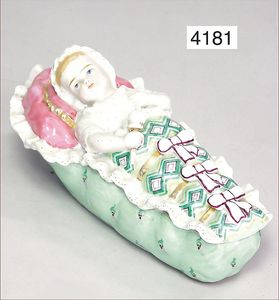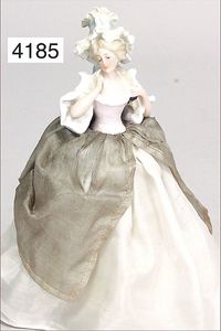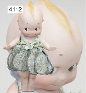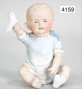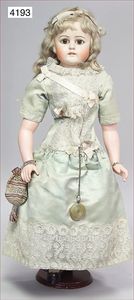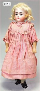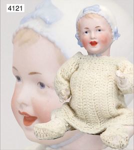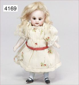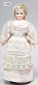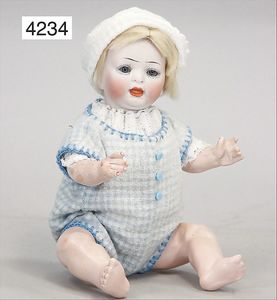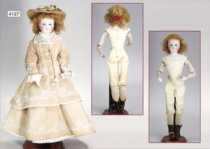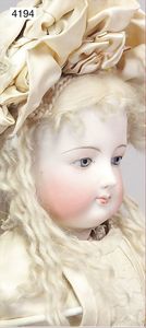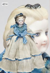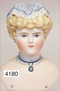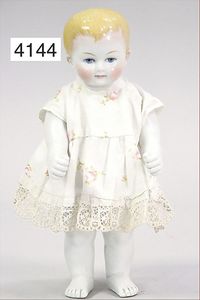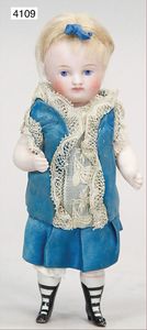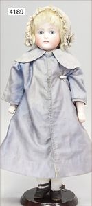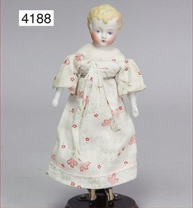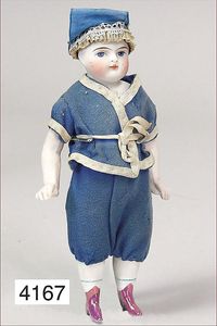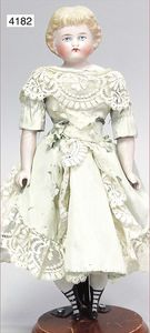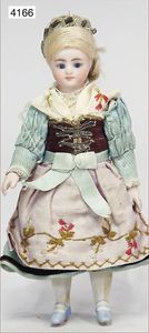 Parian, Biskuitporzellan-Kurbelkopf auf Biskuit-Brustblatt, fein ausmodellierte blonde Hochsteckfrisur, Mittelscheitel, oben ausmodellierte Schleife, feine blaue gemalte Augen, geschl. Mund, frei liegende Ohren, Biskuit-Unterarme sowie Biskuit-Beine, ausmodellierte Schuhe u. Strümpfe, Stoffkörper, alte Kleidung, 25 cm, schöne Gr., sehr schöner Ausdruck
