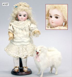 SFBJ Biskuitporzellankopf-Puppe, 36 cm, ,Kurbelkopf, braune Schlafaugen, off. Mund, oben Zähne, Zahnreihe etwas bestoßen, franz. Gliederkörper, alte Echthaarperücke, alte Kleidung, mit Haube, etwas verschlissen, mit Tasche u. Fernglas