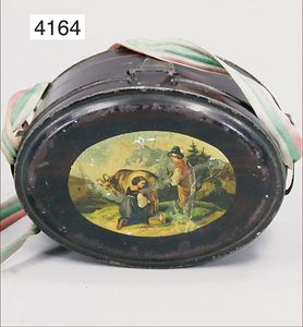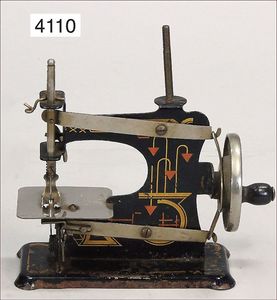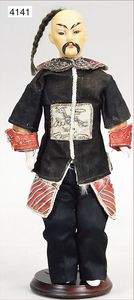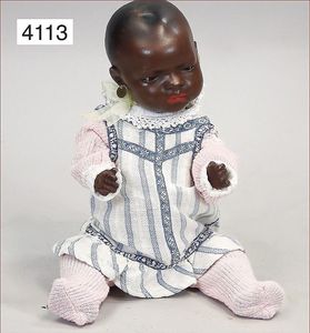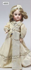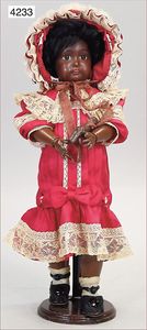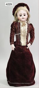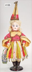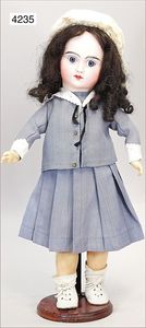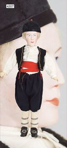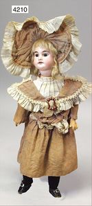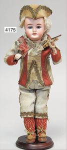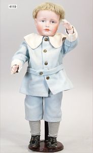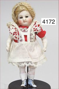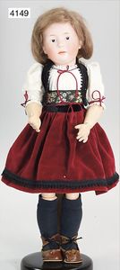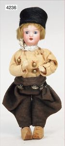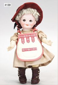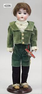 Stürzenschläger?, deutsch, Biskuit-Einbindekopf. Braune fest stehende Glasaugen, Puppe hat einen leichten Silberblick, off. Mund, oben Zähne, Holz-/Drahtkörper, mit Druckmechanik, Orig.-Kleidung, 36 cm
