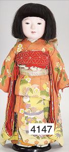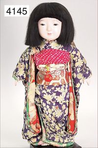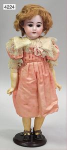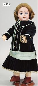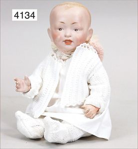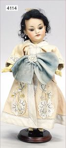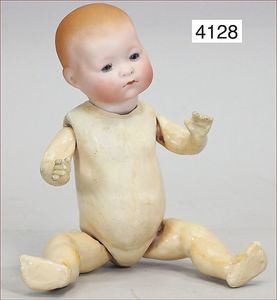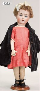 KESTNER Biskuitporzellan-Kurbelkopf, fest aufgesetzter Gipsdeckel, wurde nicht entfernt, braune Schlafaugen, Transportrisiko für Augenmechanismus beachten, off. Mund, oben Zahnreihe, Zunge, schwarze fest aufgesetzte Mohairperücke, Gliederkörper, 1 Finger an der rechten Hand weggebrochen, sonst gut, 41 cm