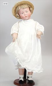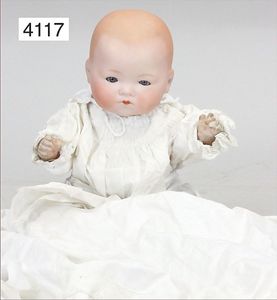 KÄMMER & REINHARD Biskuitporzellan-Charakterpuppe, 117 N, 46 cm, blaue Schelmenaugen, off. Mund, Zähne, Kinngrübchen, Toddlerkörper, mit hochgezogenen Kniegelenken, alte Mohairperücke, alte Kleidung, Schuhe u. Strümpfe