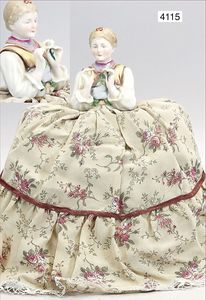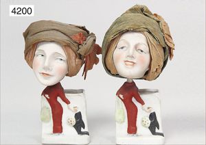 ausgefallener Damen-Wackelkopf, Biskuitporzellan, 1 x mit lächelndem Blick, sehr schön ausmodellierte Nase, auf kl. Porzellan-Sockel, ausmodellierter Körper auf Sockel mit Mann u. Blumenstrauß, 13 cm hoch, Krepp-Turban, 1 x Kopf seitl. blickend, geschl. spitzer Mund, fein ausmodellierte Nase