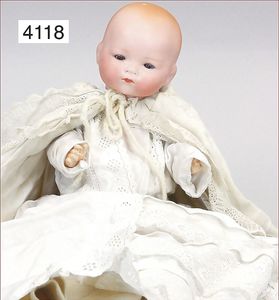 KÄMMER & REINHARD Biskuitporzellan-Brustblattkopf-Puppe, 40 cm, braune Schlafaugen, off. Mund, oben Zähne, Mohairperücke, Wachstuchkörper, Celluloid-Unterarme, alte Unterkleidung, Schuhe u. Strümpfe