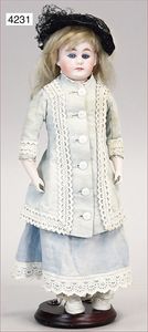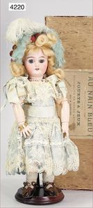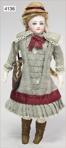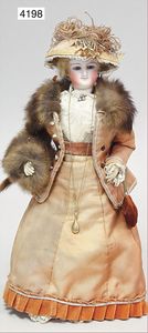 franz. Modepuppe, Biskuitporzellan-Kurbelkopf, fest aufgeklebte alte Perücke sowie Hut, fest eingesetzte blaue Paperweightaugen, fein ausmodellierte Nase, leicht lächelnd, Chip an dem linken Ohr, Ohren ausmodelliert, auf Biskuit-Brustblatt, von außen keine Risse zu erkennen, Lederkörper, einzeln abgenähte Finger, Beine mit Zwickeln, schöner Ausdruck, 34 cm, schöne Gr.